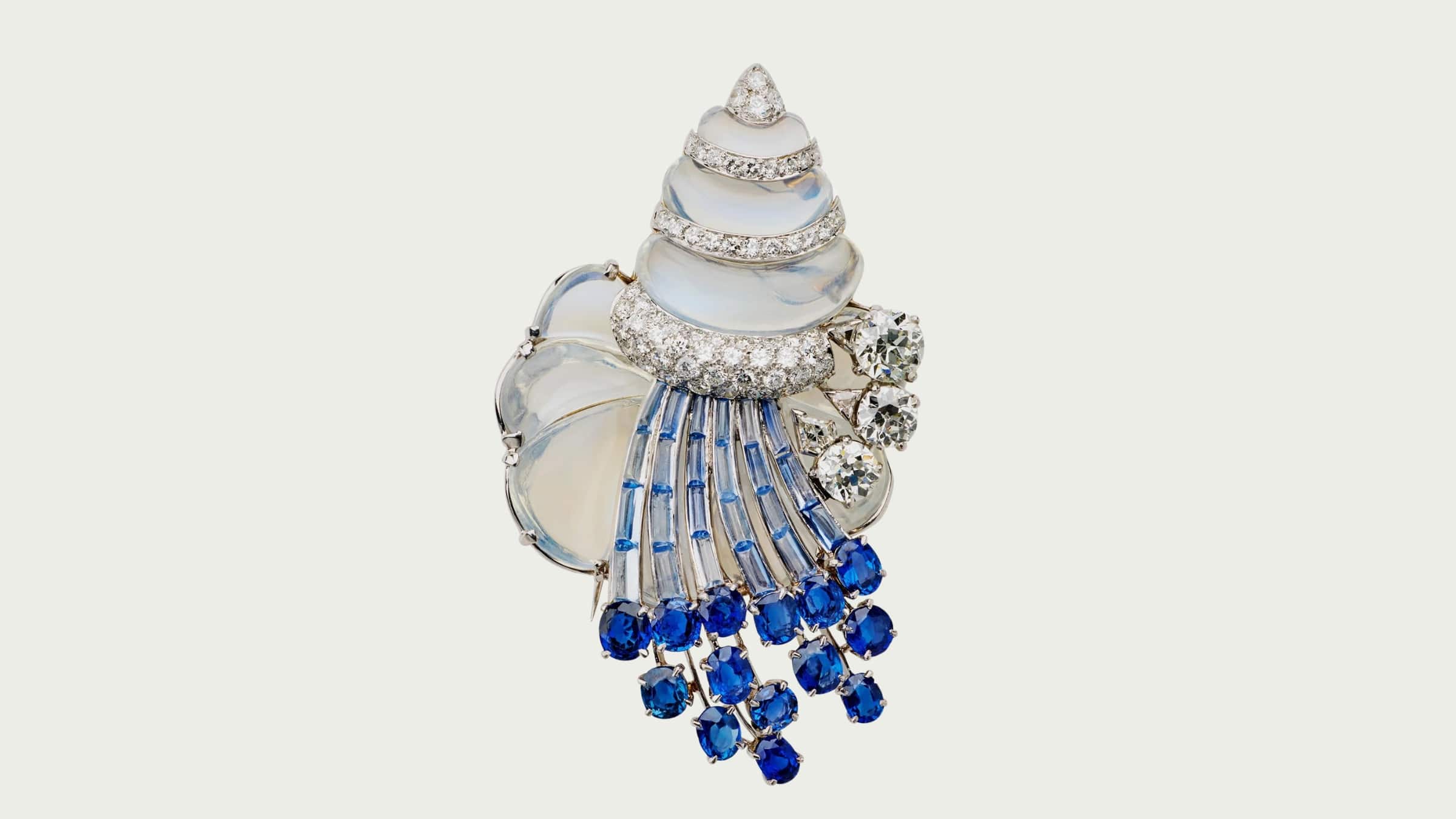 Marcus & Co. — Moonstone, sapphire, and aquamarine shell brooch (late 1930s)